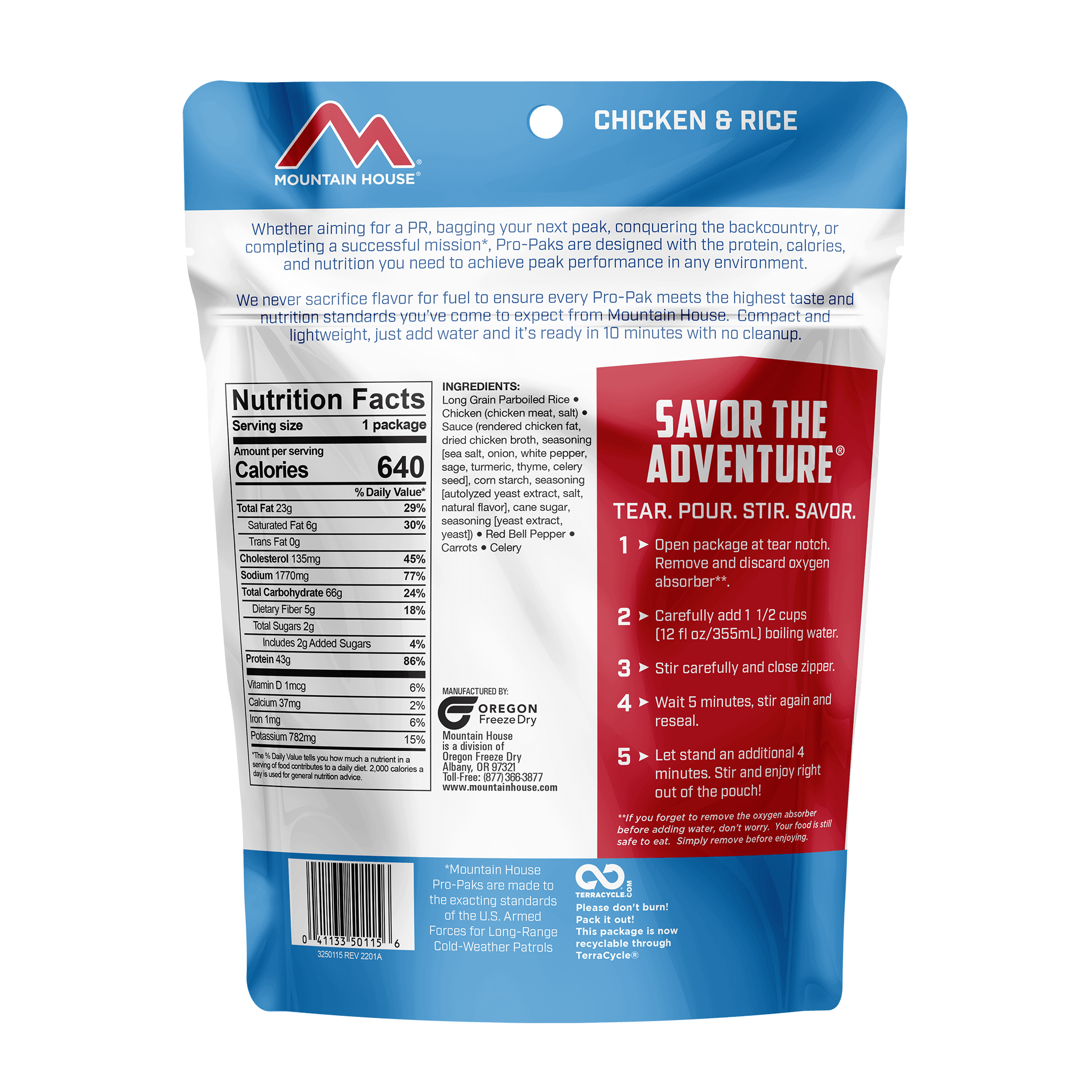 READY TO EAT IN LESS THAN 10 MINUTESWhether aiming for a PR, bagging your next peak, conquering the backcountry, or completing a successful mission, Mountain House Pro-Paks are designed with the protein, calories, and nutrition you need to achieve peak performance in any environment. They are made to the exacting standards of the U.S. Armed Forces for Long-Range-Cold Weather Patrols. We never sacrifice flavor for fuel to ensure every Pro-Pak® meets the highest taste and nutrition standards you've come to expect from Mountain House. Compact and lightweight, just add water and it's ready in less than 10 minutes with no cleanup. #savortheadventure