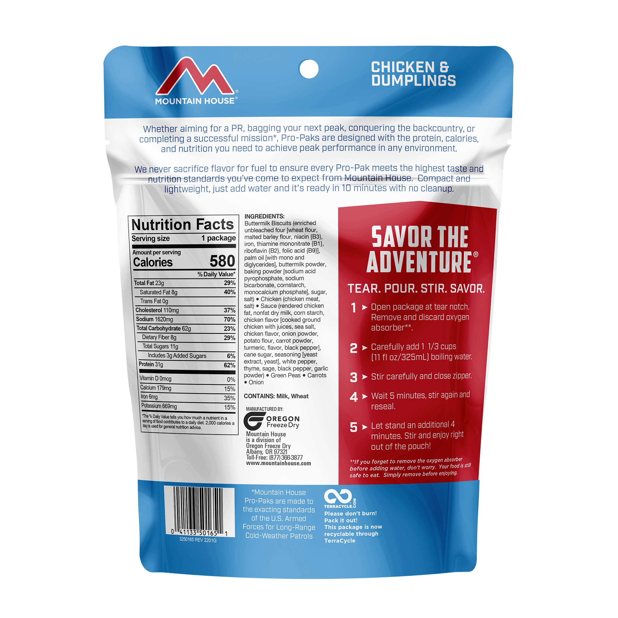 Developed to fuel you while you're bagging your next peak, we put a delicious twist on this Southern Comfort favorite. Layered with chicken, veggies, and velvety dumplings in a mouthwatering white gravy, this is the meal you've been waiting for. This freeze-dried meal contains 31g of protein and 580 calories.