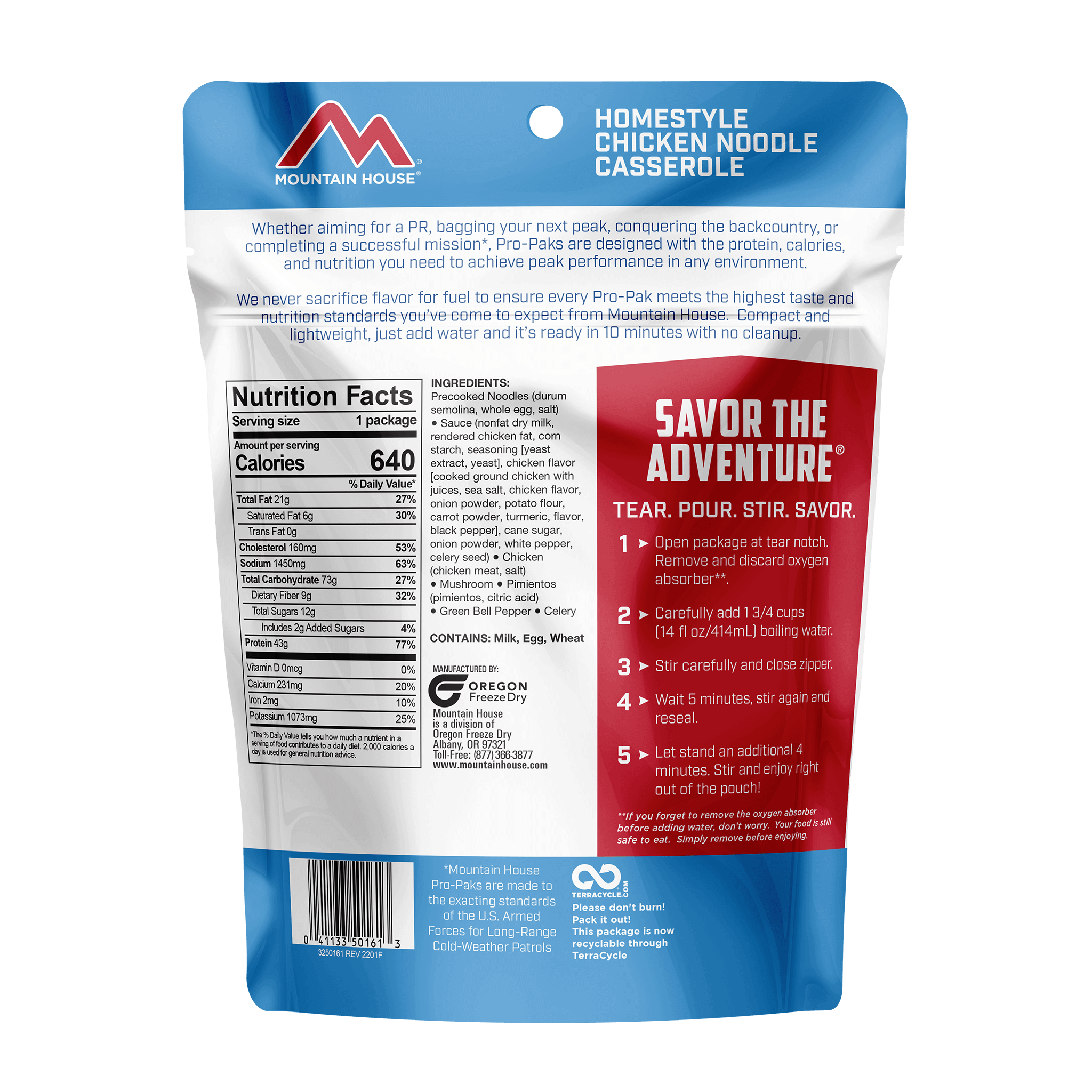READY TO EAT IN LESS THAN 10 MINUTESWhether aiming for a PR, bagging your next peak, conquering the backcountry, or completing a successful mission, Mountain House Pro-Paks are designed with the protein, calories, and nutrition you need to achieve peak performance in any environment. They are made to the exacting standards of the U.S. Armed Forces for Long-Range-Cold Weather Patrols.
