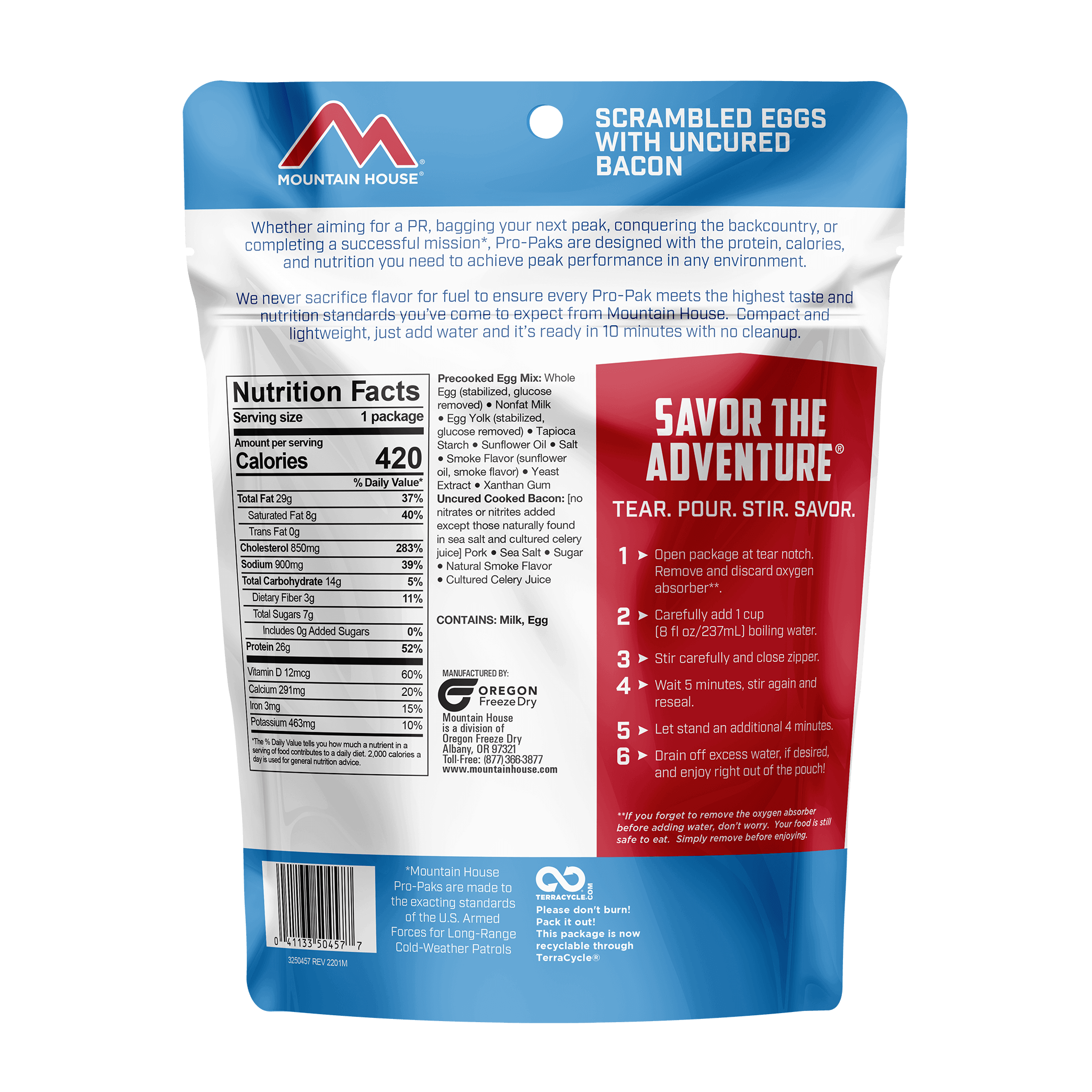 READY TO EAT IN LESS THAN 10 MINUTESWhether aiming for a PR, bagging your next peak, conquering the backcountry, or completing a successful mission, Mountain House Pro-Paks are designed with the protein, calories, and nutrition you need to achieve peak performance in any environment. They are made to the exacting standards of the U.S. Armed Forces for Long-Range-Cold Weather Patrols.